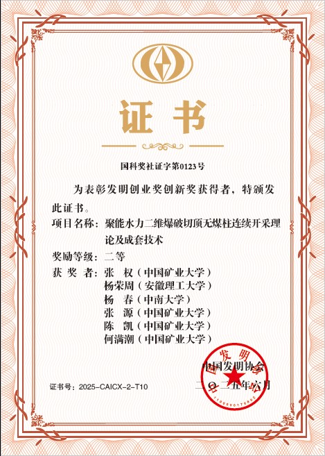 为第一完成单位,联合安徽理工大学和中南大学完成的科研项目“聚能水力二维爆破切顶无煤柱连续开采理论及成套技术”获中国发明协会发明创业奖创新奖二等奖。