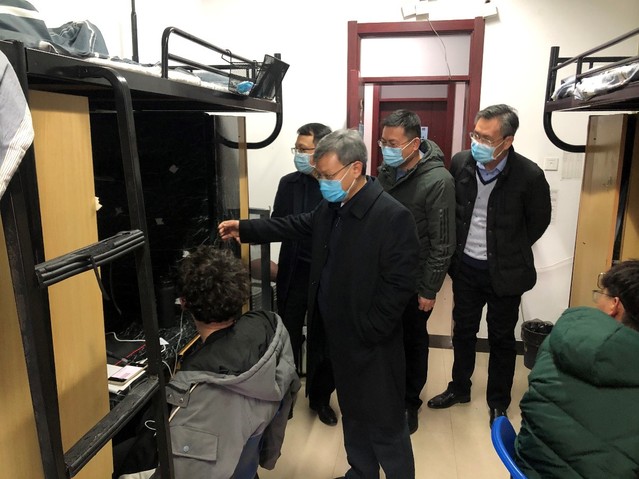 上午9点,校党委副书记蔡世华,学生工作处处长冯震,副处长畅军亮、关福远一行四人到我院学生宿舍检查学生在线学习情况。蔡书记一行与同学们进行了亲切交流,询问了同学们网络畅通情况、教师授课质量、网课学习成效等,并认真听取同学们对线上教学的感受和意见,鼓励大家积极配合学校线上教学安排,共同提高线上学习效果。