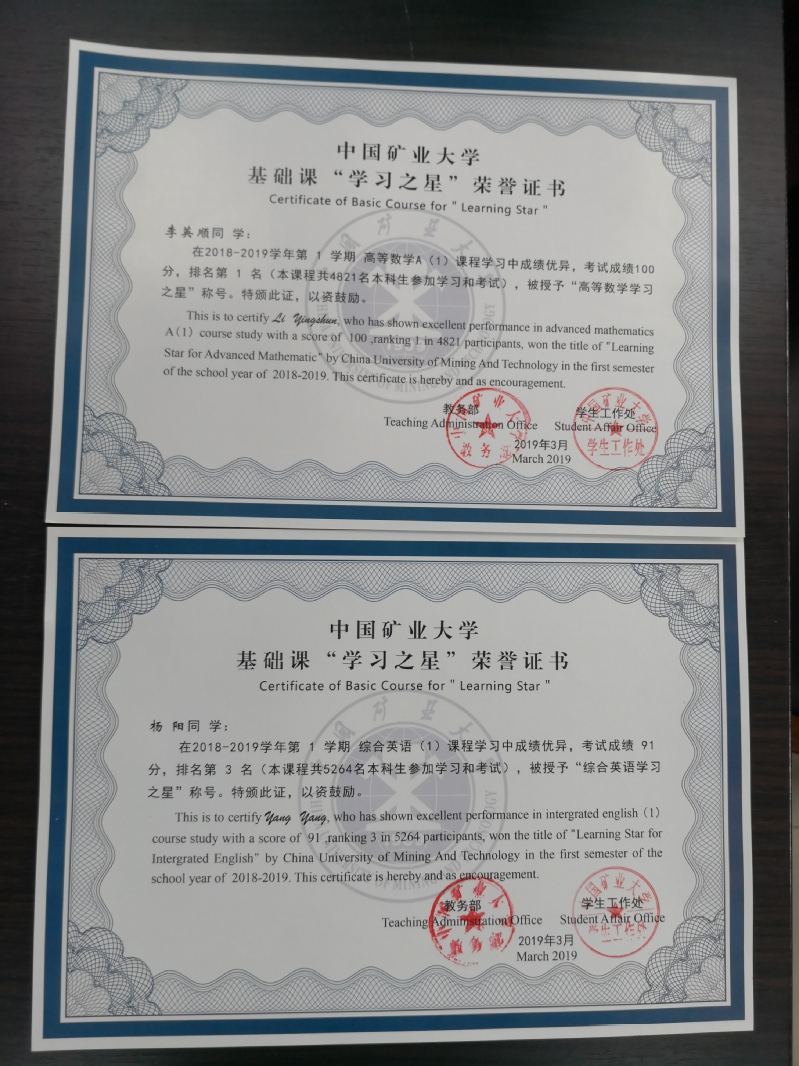 优良学风班”荣誉称号,李英顺等22名学生荣获《高等数学》“基础课学习之星”荣誉称号;贺筱康获《大学物理》“基础课学习之星”荣誉称号;杨阳等3名学生荣获《综合英语》“基础课学习之星”荣誉称号。
