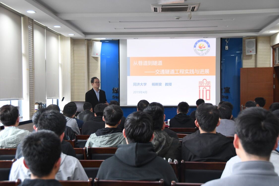 杨新安教授介绍了采矿工程中巷道与隧道的主要联系与差异、研究内容的区别,着重介绍了隧道工程在我国的发展现状与需求、隧道的特质、隧道工程实践与进展情况,隧道工程中的难点与科研重点,并以京张高铁八达岭长城站为例详细介绍了隧道课题研究成果。报告会最后,杨新安教授为师生们分享自己的科研工作感悟,分享了吴孟超院士、孙钧院士、汪品先院士退休后仍然坚守在科研第一线的事迹,殷切期望在座同学们要应用知识去分析思考问题,积极深入工程实践,要有为国家工程建设培养奉献和实干精神。报告结束后,与会师生和杨新安教授进行了深入的交流互动,报告会在全体师生的掌声中落下帷幕。