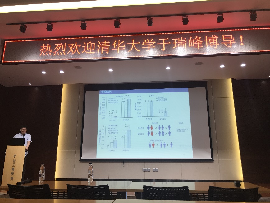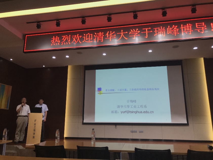 于老师以“男女搭配,干活不累:工作组织中的社会助长效应”为题,既生动活泼又科学严谨地展开了相关研究的介绍。他首先介绍工作组织、团队(team)、共同作业者(co-actors)的概念内涵及特点,以及社会助长效应的概念、内容、解释机理及其实际应用。然后,重点介绍两项最新的研究成果:其一是共同作业者的性别组成对个体作业绩效的影响研究,其二则是共同作业者的性别对个体作业绩效影响的机理研究,阐述共同作业者的性别组成调节社会助长效应强度的规律及其潜在机理。于老师给大家介绍了研究实验的设置流程,并对以上研究成果结合实验进行了分析和总结。值得注意的是,该研究在国际上首次从生理和神经系统层面揭示了社会助长效应的影响机制和作用机理,是对社会助长效应相关解释理论的有效补充与显著拓展,在同行专家评议过程中得到高度认可,且在实际群体共同作业组织设计中有重要指导意义。最后,他就研究成果引出其应用前景和启示,以及工业工程在当今时代背景下的发展之路。
