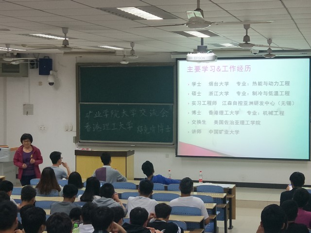 此次学习经验交流会我们邀请了香港理工大学建设及地政学院毕业的郑克晴博士与大家分享学习经验,来自矿业学院2017级矿业类1班和2班及2016级采矿4班的约80位同学参加了此次交流会。交流会由日本九州大学地球资源工程系毕业的钱德雨博士主持,整场交流会持续约70分钟。