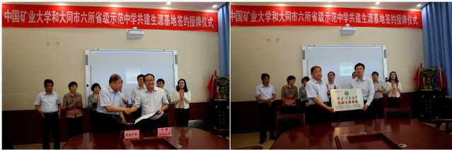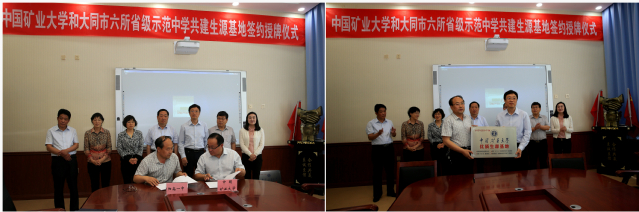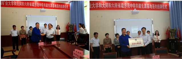 党委书记陈新忠代表学校与大同市六所中学校长分别签署了“联合选拔培养优秀学生”协议。曹德欣副书记分别向六所中学授予“优质生源基地”牌。