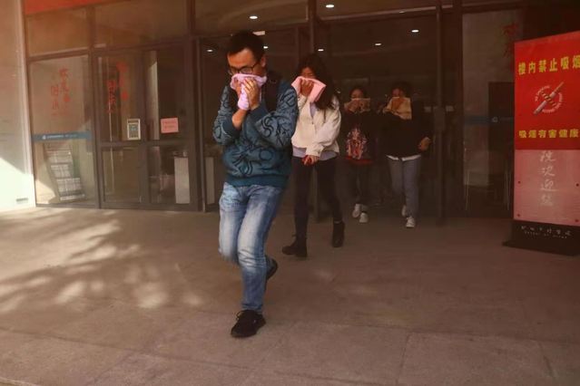 演习前,学院对全体师生进行了应急逃生注意事项说明,并对学院安全员进行了相关工作布置。16时30分,保卫处工作人员在学院楼各个楼层模拟释放烟雾并拉响警报,学院安全员按照制定的预案迅速组织师生疏散逃生。参演师生用湿毛巾捂住口、鼻,按照应急疏散指示标识和既定的应急疏散路线,安全有序地疏散到楼外安全区域。