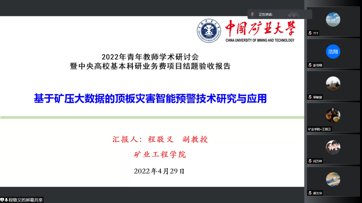 组织召开了2022年青年教师学术研讨会,暨中央高校基本科研业务费项目结题验收会。学院共邀请了7名专家对青年教师进行学术指导,其中2名校外专家是东北大学朱万成教授、山西能源学院院长冯国瑞教授,5名院内专家是屠世浩教授、窦林名教授、刘长友教授、李桂臣教授和马丹教授。共有160余名师生参加了在线会议,会议由马立强副院长主持。