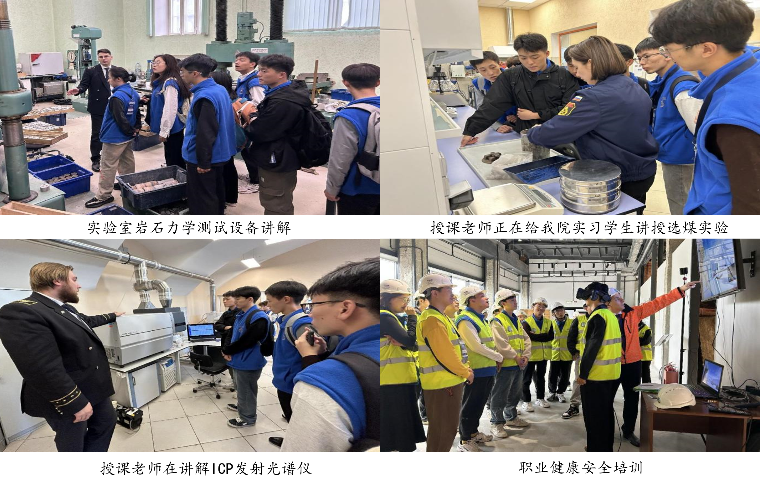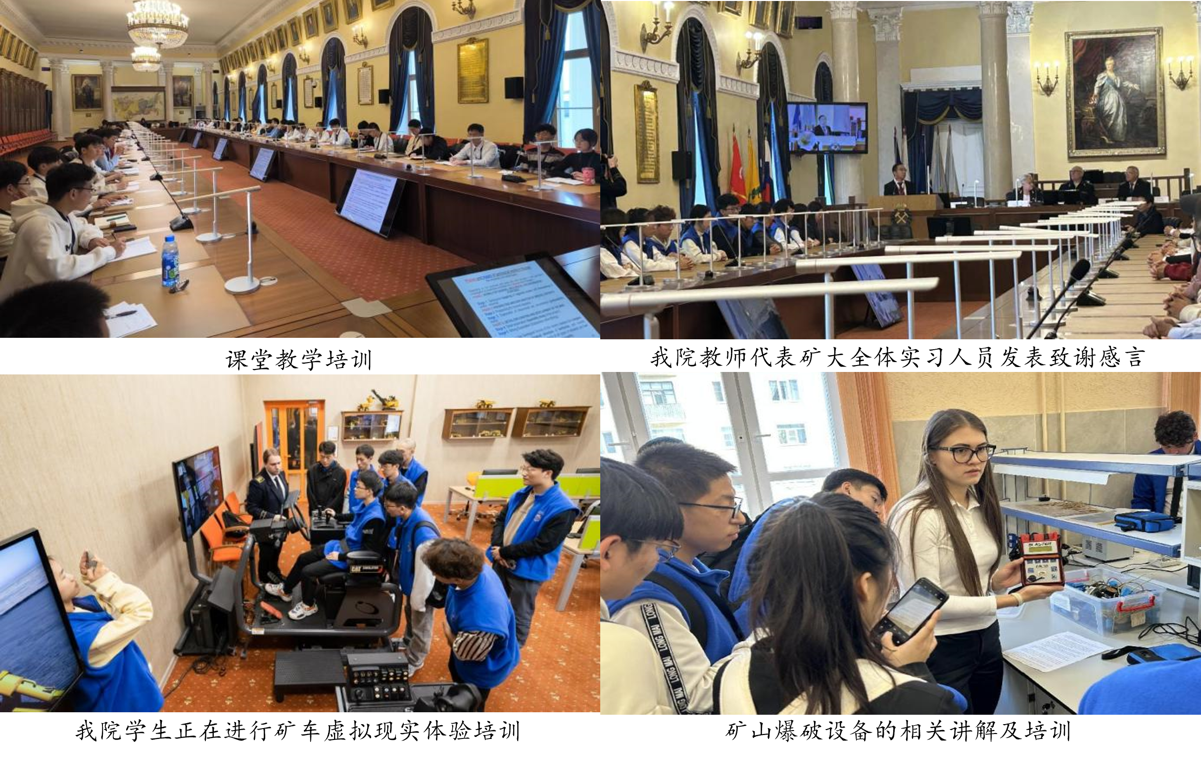 本次实习得到了俄罗斯圣彼得堡矿业大学的高度重视,在住宿、饮食、培训课程等方面都进行了精心的安排,并在学校官网进行了三次跟踪报道。本次实习的内容涵盖现代地下(露天)采矿、现代洗选技术、固体废弃物处理、地质力学、矿山环境保护、矿山职业健康、矿业数字化转型、矿业数值计算软件等多个方面。实习形式包括学术讲座、课程培训、实验室参观、虚拟实景矿业体验、安全生产培训、历史人文参观等。参加本次实习的学生代表陈家燕表示:“这次实习让我更加深入地了解了矿业领域的前沿技术和挑战,也为我未来的职业发展打下了坚实的基础”,参加本次实习的学生代表向高航表示:“我领略了这里充满魅力的文艺气息以及深厚的学术底蕴,我非常珍视在这个城市里所度过的难以忘怀的时光,还有我在这里所学到的先进矿山开采知识”。