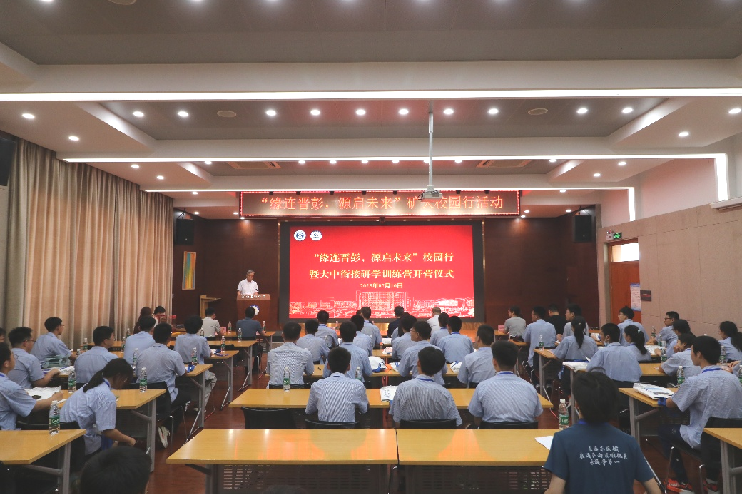 刘晓瑜副校长致辞并宣布开营。他首先感谢矿大的精心筹备,强调山西作为能源大省,与矿大在能源领域有着深厚的历史渊源与天然的合作基础。太原五中始终以“诚正明毅 尚德求真”的校风培育学子,此次研学是拓宽学生视野、衔接大中教育的重要契机,希望同学们能以谦逊之心汲取知识,以探索之志触摸科技,更要在交流中传承三晋文化,将所学所感转化为成长动力,未来为能源事业贡献青春力量。