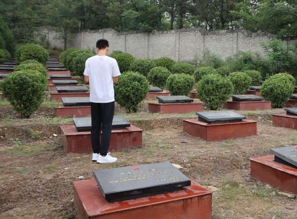 随后,队员们来到革命烈士纪念碑后面的山上,为革命烈士献花。在这里,安然栖息着一排排的革命烈士,他们中牺牲时最小的年仅16岁,看到这里,队员们心中都隐隐作痛,心中更增添了对革命烈士的敬仰之情。这里没有尘世的喧嚣,只有苍翠的松柏傲然挺立,虽然战争已然结束,但他们仍然静静地以这种特殊的方式继续存在着,守护着这片土地。革命烈士的肉体或许早已泯灭,但他们的精神仍一代代地传承着,激励着后人不断奋勇前行!