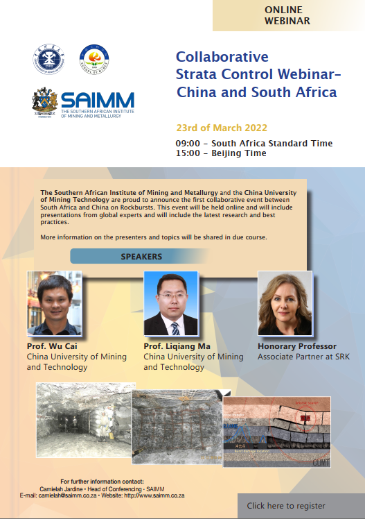 学术会议 贝勒漫画 - 学科动态 - 学术会议 - 正文 Collaborative Strata Control Webinar - China and South Africa 作者:办公室新闻发布浏览:时间:2022-03-23 ZOOM注册网址: 新闻来源:人才与学科工作办公室 摄影: 责任编辑:文涛 审核:马立强