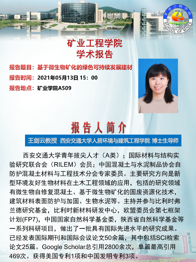 学术会议 贝勒漫画 - 学科动态 - 学术会议 - 正文 学科报告:基于微生物矿化的绿色可持续发展建材 5月13日15:00 矿业学院A509 作者:董成亮浏览:时间:2021-05-07 新闻来源:贝勒漫画 摄影: 责任编辑: 审核: