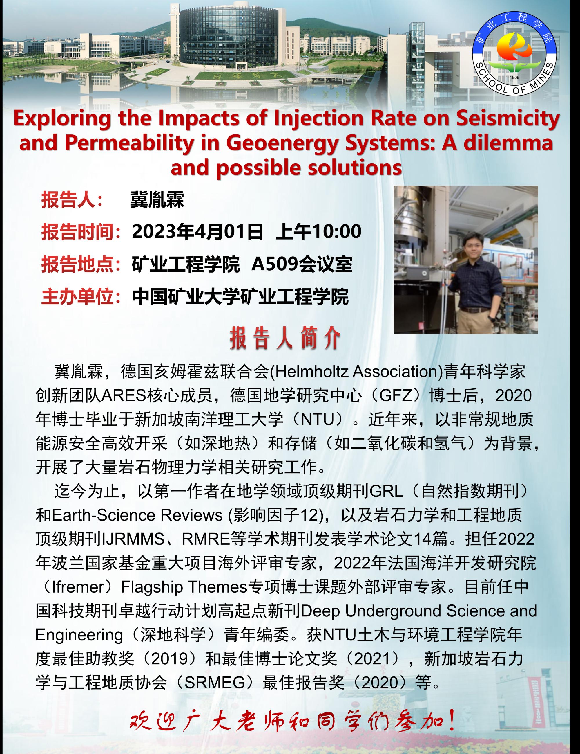 学术会议 贝勒漫画 - 学科动态 - 学术会议 - 正文 Exploring the Impacts of Injection Rate on Seismicity and Permeability in Geoenergy Systems: A dilemma and possible solutions 作者:办公室新闻发布浏览:时间:2023-03-30