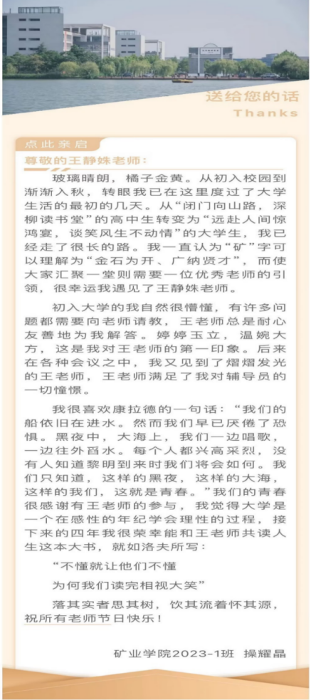 活动前期收集了学生们对老师的祝福及贺卡寄语等,活动当天通过发送短信、送出贺卡等方式向所有老师致以诚挚的感激与祝福,用真诚的祝福让老师们感受到秋日里的温暖。